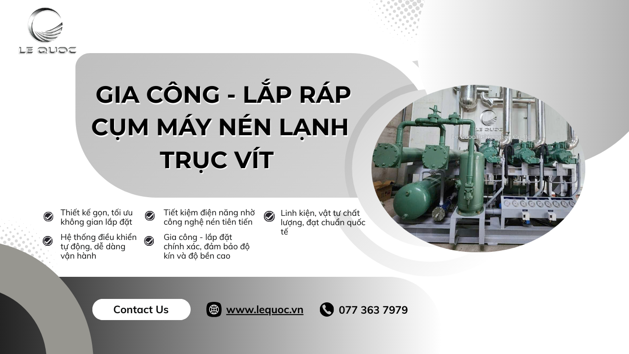 Trong các hệ thống lạnh công nghiệp, cụm máy nén lạnh trục vít đóng vai trò quan trọng trong việc đảm bảo hiệu suất và độ bền cho toàn bộ hệ thống. Với kinh nghiệm nhiều năm trong ngành cơ điện lạnh, Công ty Lê Quốc cung cấp dịch vụ gia công - lắp ráp cụm máy nén lạnh theo nhu cầu thực tế của khách hàng.